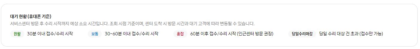 대기 현황 (휴대폰 기준) 서비스센터 방문 후 수리 시작까지 예상 소요 시간입니다. 조회 시점 기준이며, 센터 도착 시 방문 시간과 대기 고객에 따라 변동될 수 있습니다. 원활 30분 이내 접수/