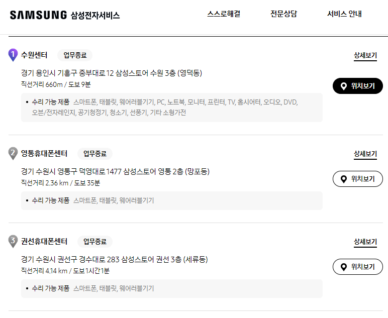 - 수원센터: 경기도 수원시 팔달구. 휴대폰, 노트북, TV 등 다수 제품군 수리 가능.